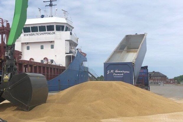 Norske "Lafjell" laster korn i Korsør Havn juni 2021. Foto: Danske Havne.