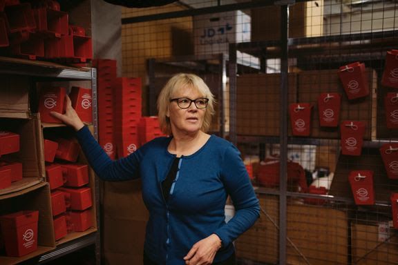 I kælderen hos Folkekirkens Nødhjælp står 10.000 røde indsamlingsbøsser og samler støv. De skulle tages i brug på søndag, men må blive i kælderen pga. corona. Det bekymrer generalsekretær i Folkekirkens Nødhjælp, Birgitte Qvist-Sørensen. Foto: Marie Hald