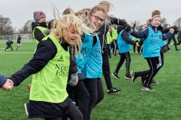 Skoleelever lærer om sundhed gennem fodbold – både pigerne og drengene synes, det er sjovt!